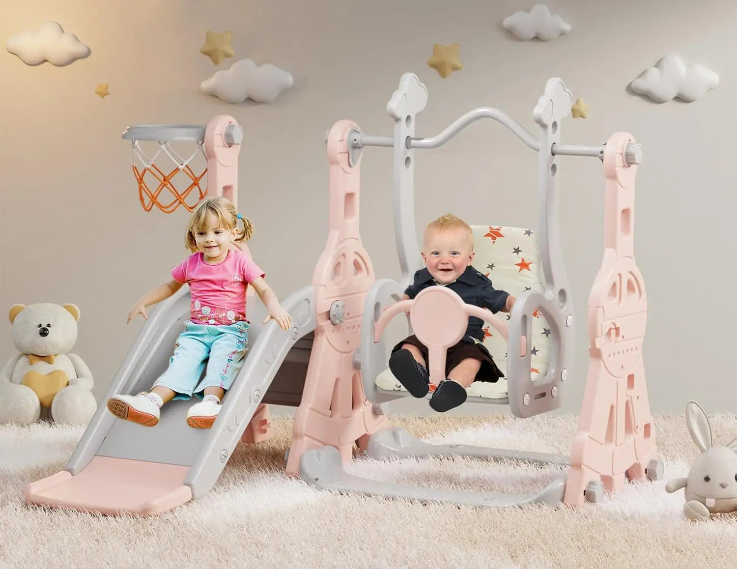 2. 4 in 1 Swing and Slide Set - Kid slide is a versatile toddler playground, which includes climber, swing, slide and basketball shooting feature, which offers a variety of activities to keep children engaged and entertained. To ensure stability and safety during use, it is recommended to add water or sand to the base of the swing.