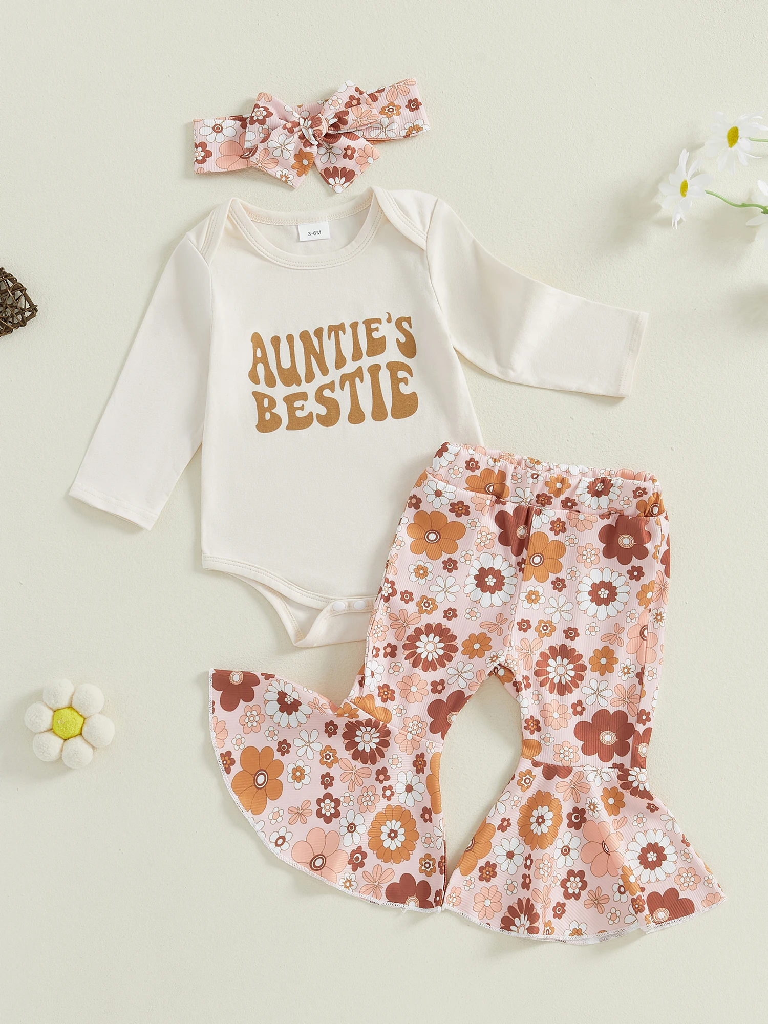 Baby Girl Fall Outfits Letter Print Long Sleeve Romper Flower Print Flare Pants Headband 3Pcs Clothes Set